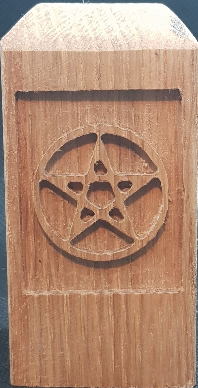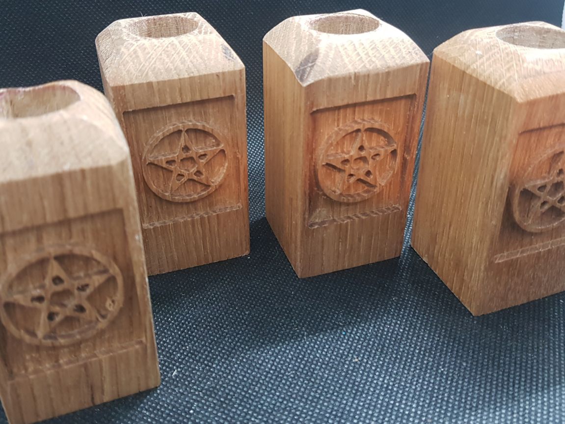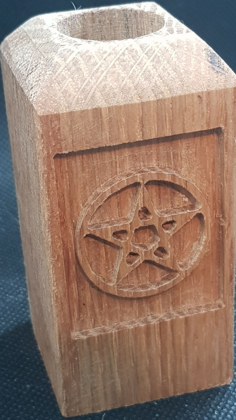 Perfect as an ornament or as part of a ritual, thisĀ delightful small candle stick is carved from solid oak and features an engraved pentagram. Taking a standard taper candle it is finished with Danish oil to complement the rich natural beauty of the wood.