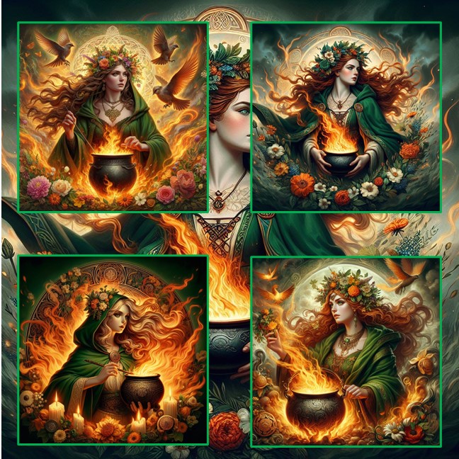 A series of rich images portraying Bridgit the pagan triple goddess. of healing fire and poetry.