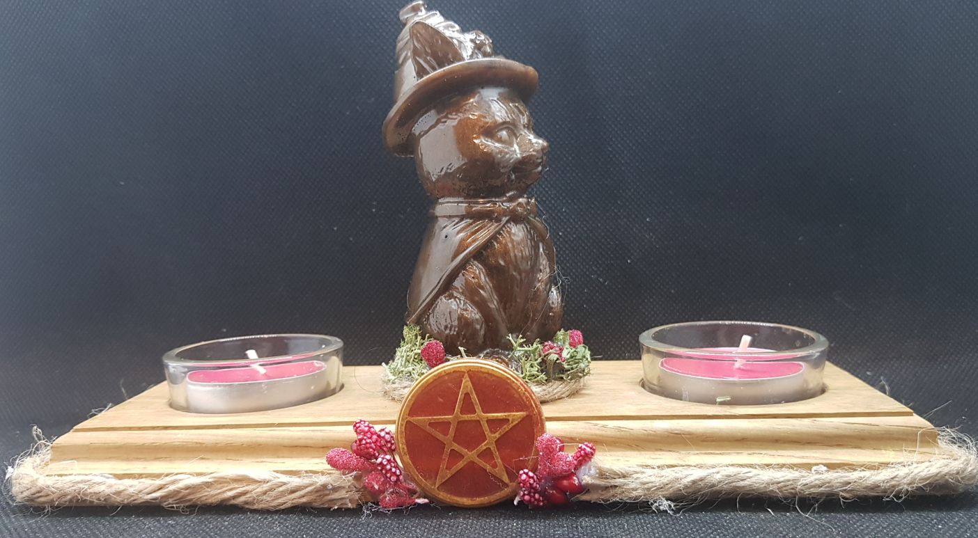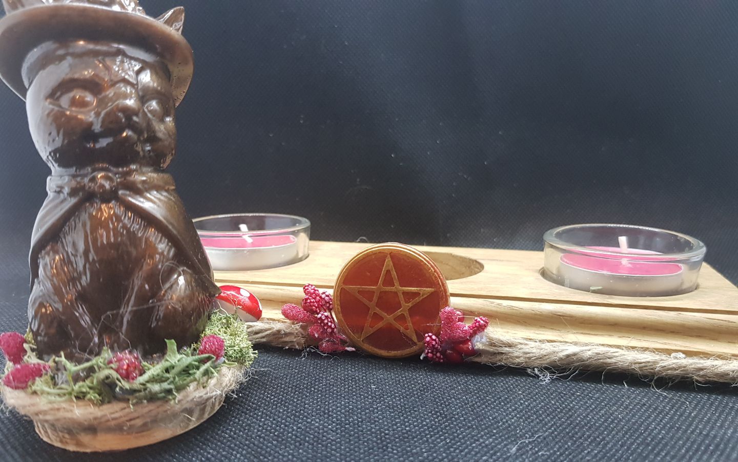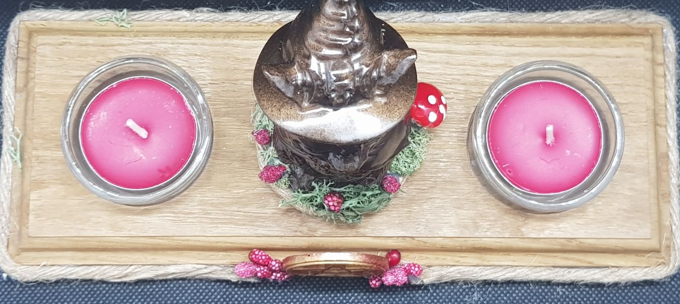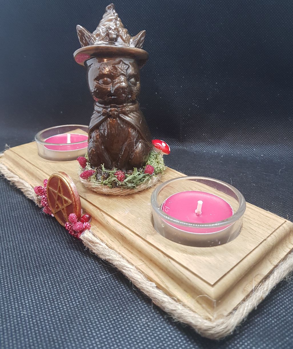 Charmingly styled design created in sculpted natural oak featuring 2 embedded glass tealight holders and a delightful bronze coloured cat figure resplendent in hat and robe and seated on a bed of forest flowers. Finished in Danish oil with a rustic rope border and spiritual motif, the cat figure is removable leaving a third tealight size aperture should more illumination be preferred. A guaranteed focus of interest on any occasion.
