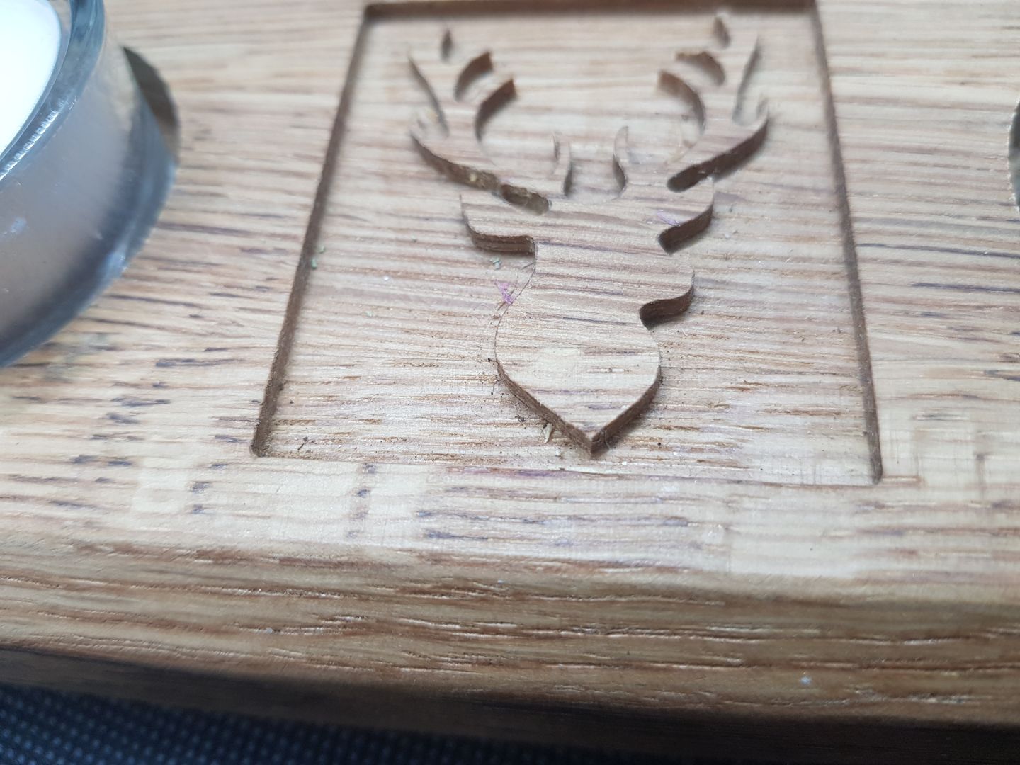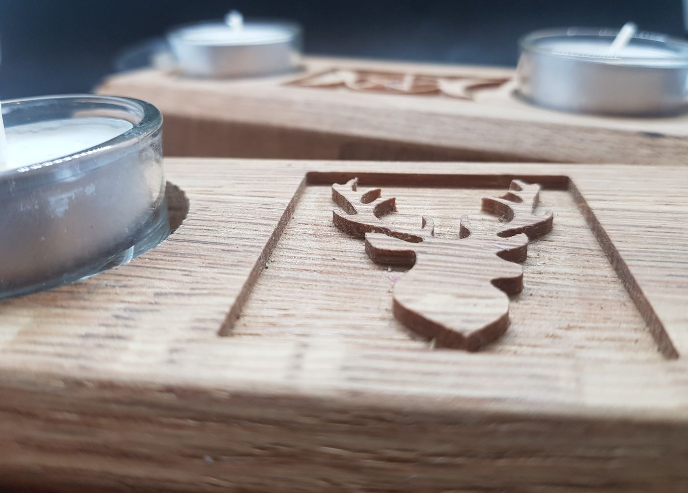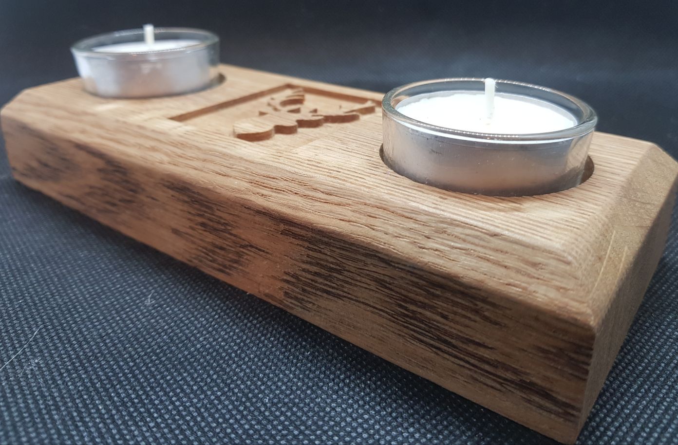 Chunky oak table centre with tealights and stamp style central motif finished with Danish oil.