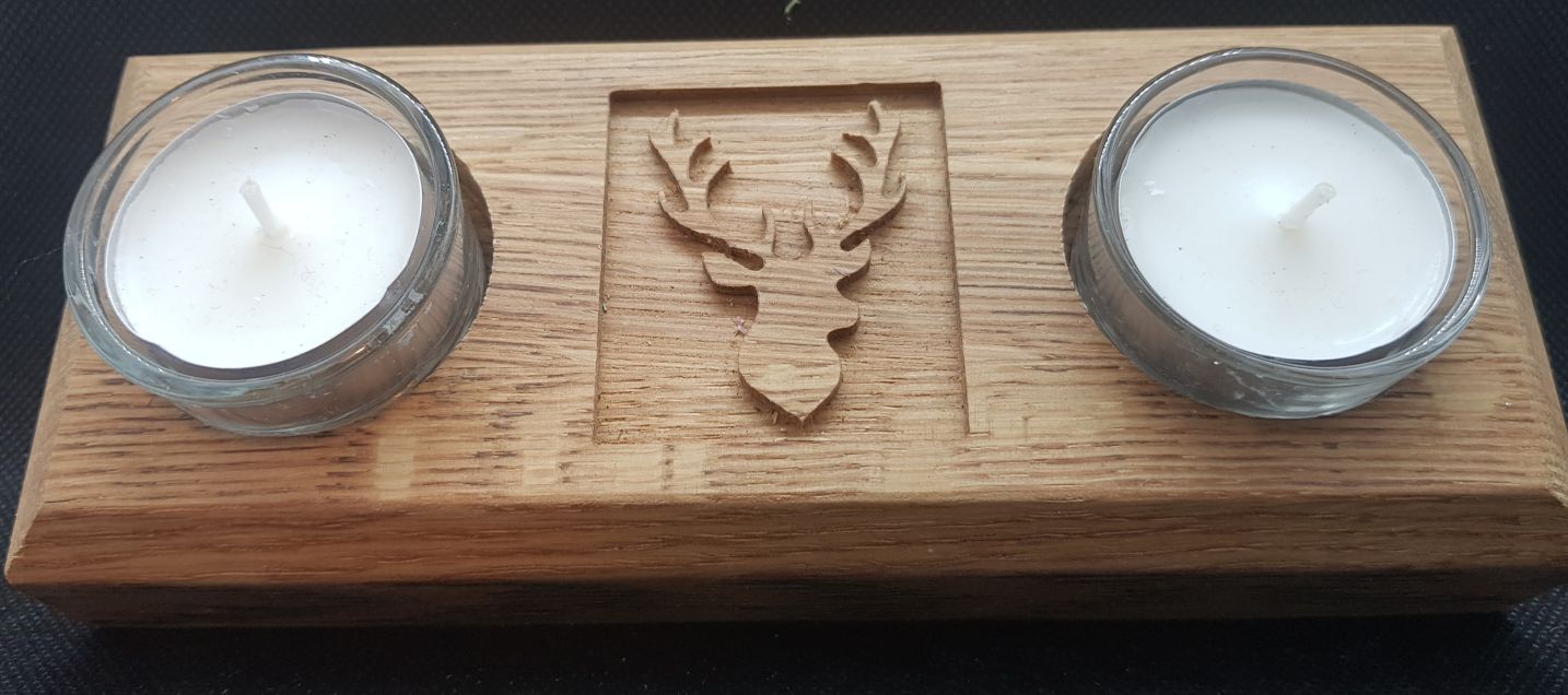 Substantial Oak tealight holder featuring 2 candles and a striking central carved motif. Bordered by an elegant chamfer and finished with Danish oil the product comes with a choice of stag or triple goddess designs.