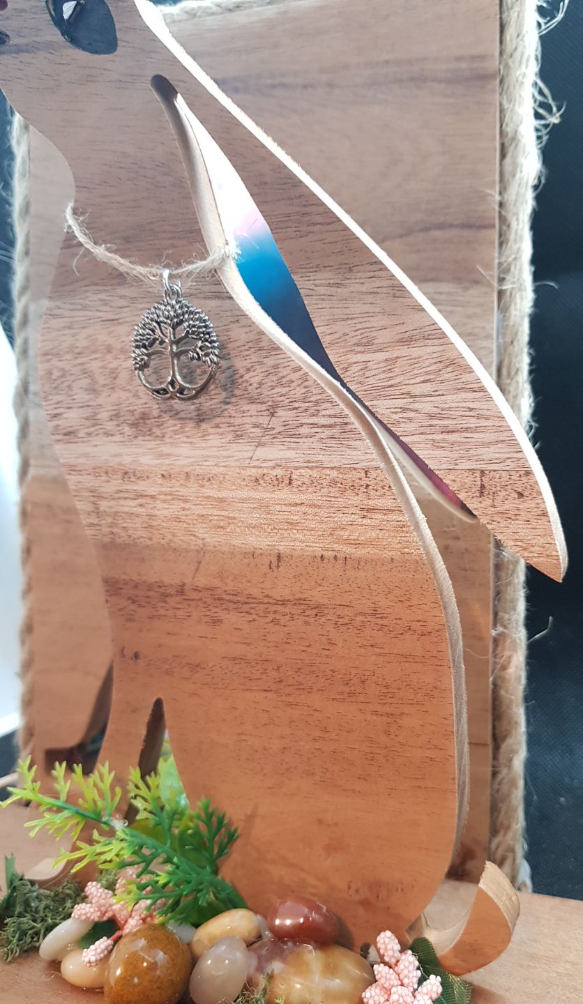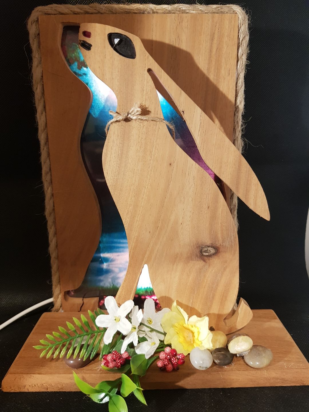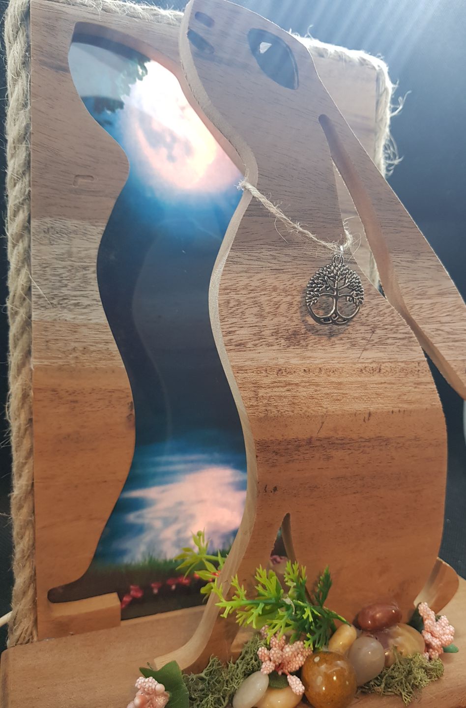 Enchanting hare made from repurposed hardwood gazing up to the moon sitting in front of a moon and spring tide landscape. An arrangement of flowers and stones at the base highlight the the feeling of spring in this delightful piece. Contains 5v LED lights powered by USB which accentuate the background images. Trimmed with rustic twine and left with a sanded w0od finish, a talking point for any room.