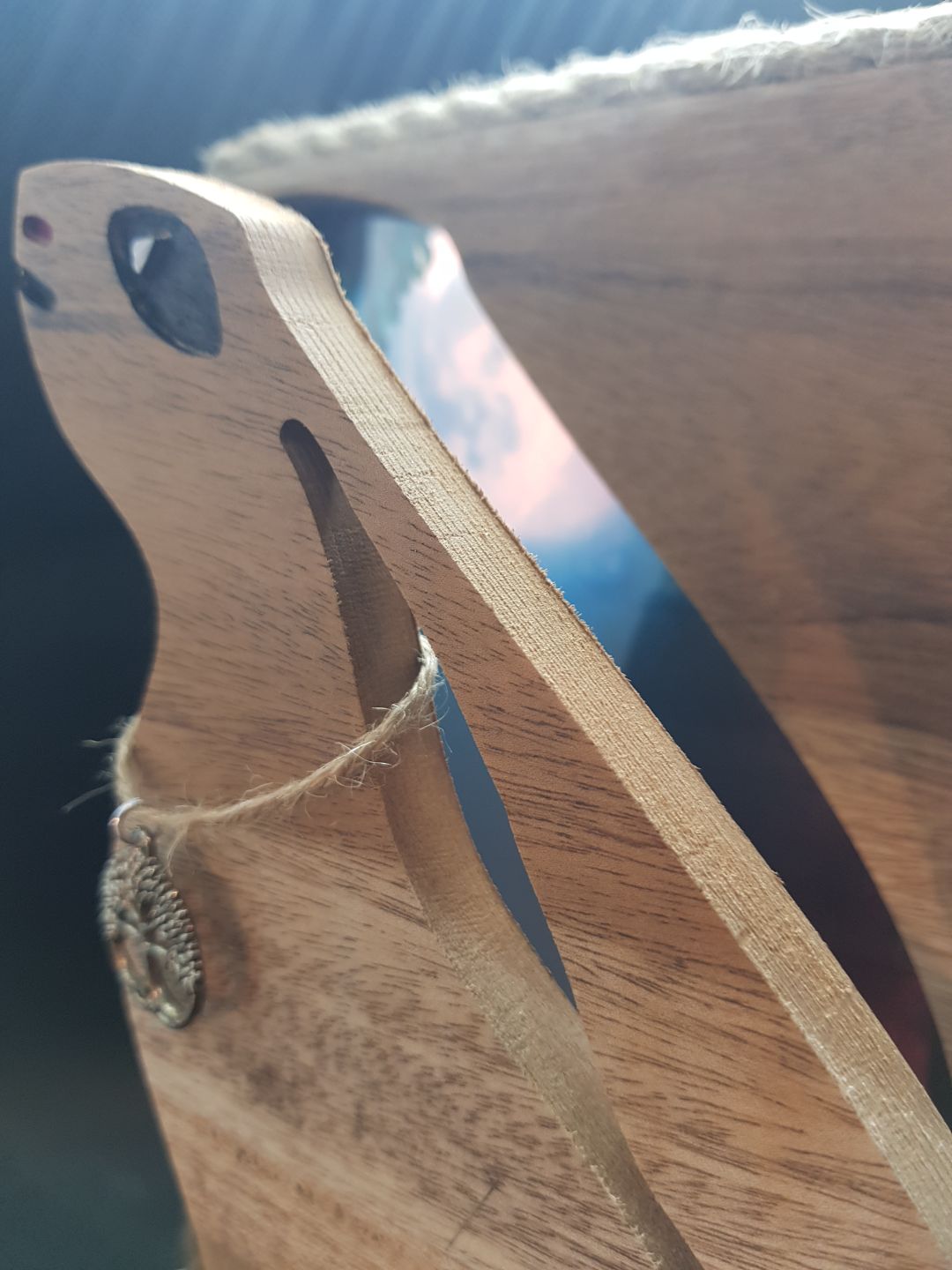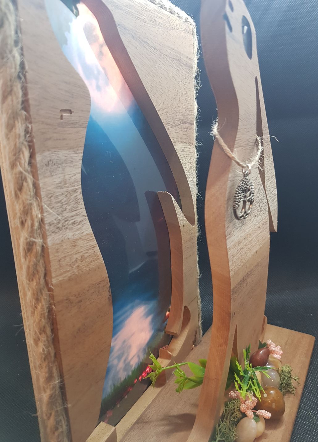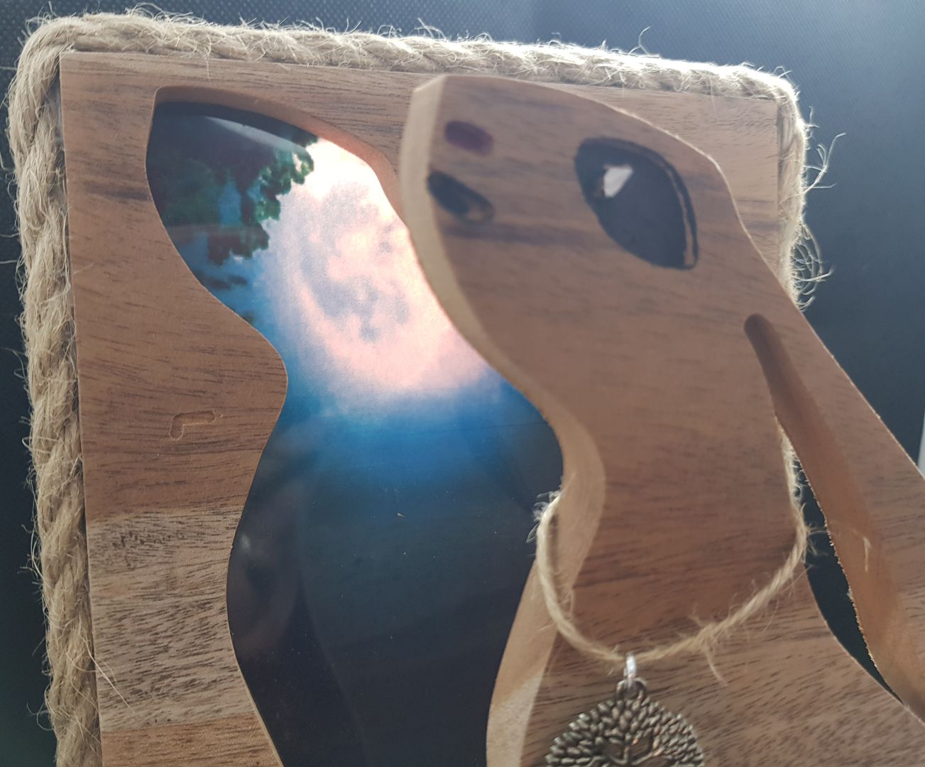 Enchanting hare made from repurposed hardwood gazing up to the moon sitting in front of a moon and spring tide landscape. An arrangement of flowers and stones at the base highlight the the feeling of spring in this delightful piece. Contains 5v LED lights powered by USB which accentuate the background images. Trimmed with rustic twine and left with a sanded w0od finish, a talking point for any room.
