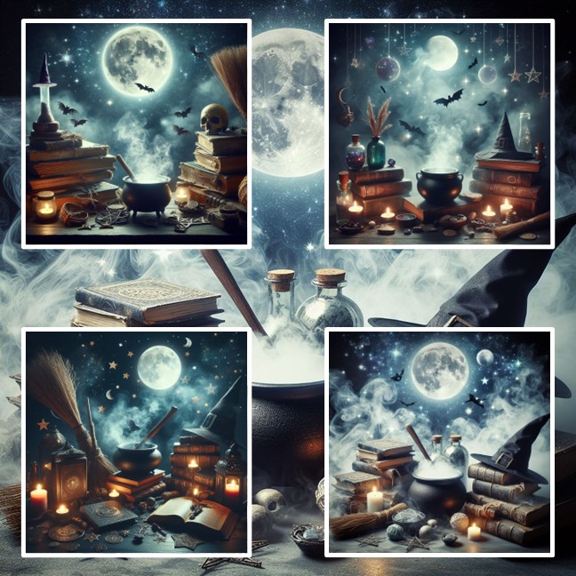 Enthralling series of illustrations depicting the tools of magic illuminated by candle light in mystical moonlight scenes.