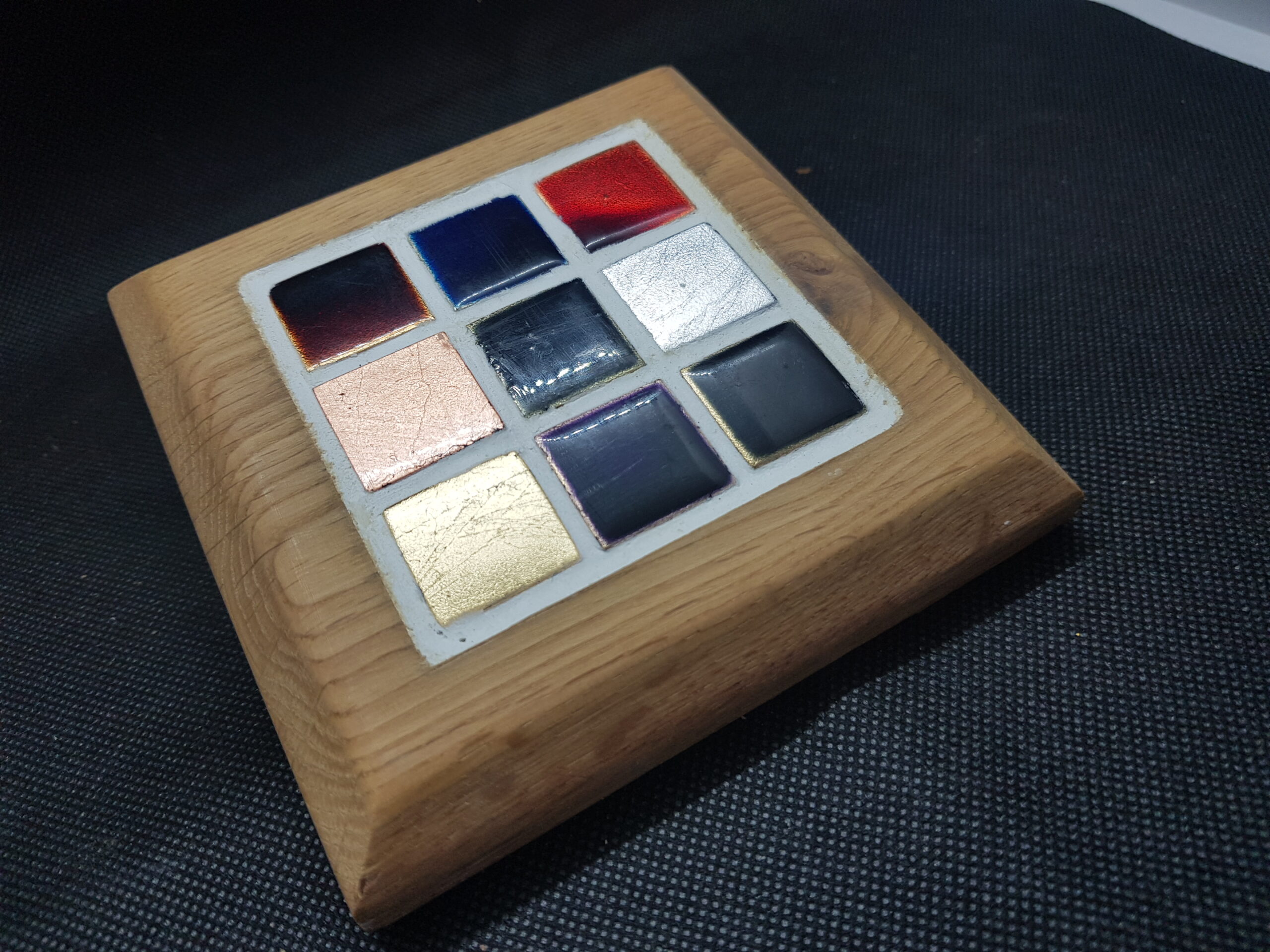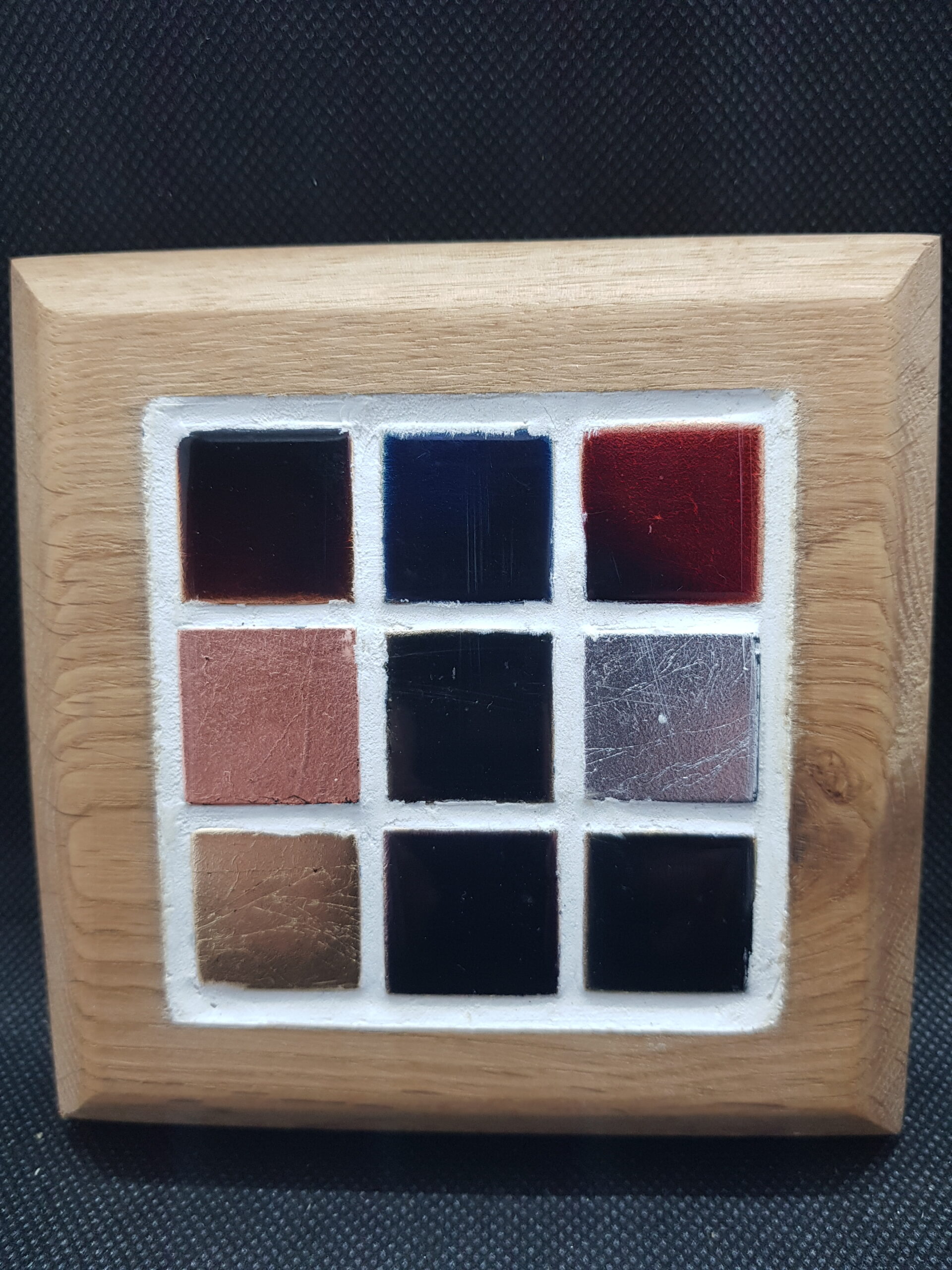 Glass tiles in opulent shades of red, blue, gold, silver and bronze fuse in a delightfully majestic design . Available in natural and burnt oak finishes.
